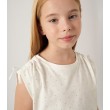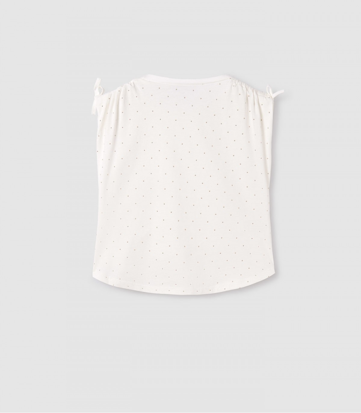 Varrukateta tüdrukute topp sobib hästi nii argipäevaks kui ka pidulikumaks puhuks. Pehme puuvillane kangas on kaunistatud sädelevate täppidega ja kroogetega õlgadel.